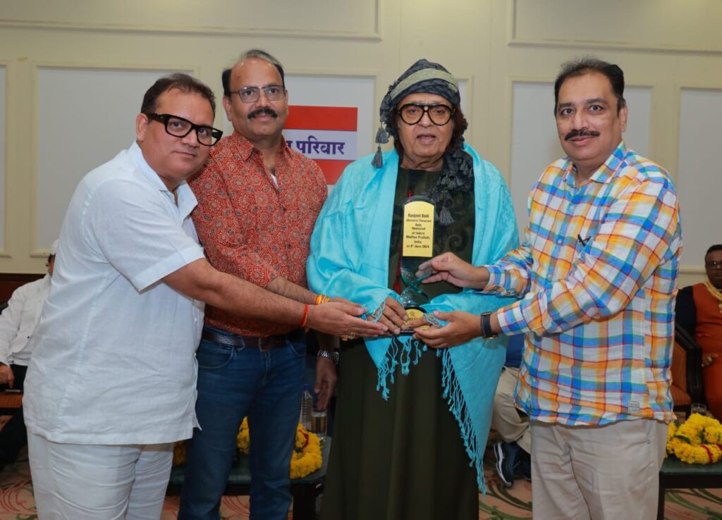 Indore (Team Newsbuddy): Alma Parivar honoured film actor Ranjit, Bindu Dara Singh, film producer Vinod Bachchan, music director Usman Khan and Golden Man in a ceremony organized at DLF Club. National poet Prof. Rajeev Sharma and State Press Club, MP president Praveen Kumar Khariwal felicitated actor Ranjit by presenting him a shawl and a memento. Many dignitaries including Alma Parivar patron Advocate Santosh Shukla were present on this occasion.