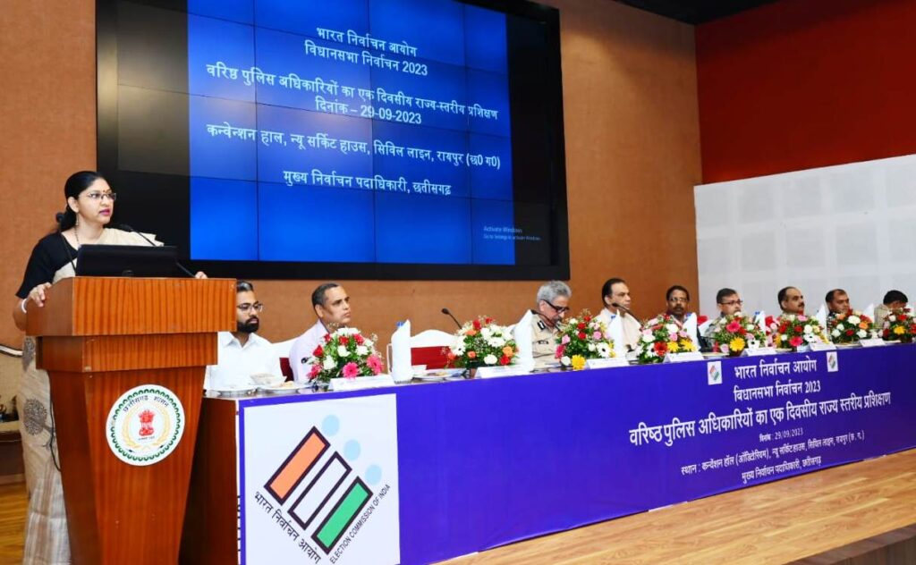 रायपुर. 29 सितम्बर 2023. मुख्य निर्वाचन पदाधिकारी कार्यालय द्वारा भारत निर्वाचन आयोग के निर्देशानुसार छत्तीसगढ़ में आगामी विधानसभा आम निर्वाचन-2023 के लिए राज्य के वरिष्ठ पुलिस अधिकारियों के लिए एक दिवसीय प्रशिक्षण का आयोजन किया गया। रायपुर के नवीन विश्राम भवन में आयोजित प्रशिक्षण के दौरान छत्तीसगढ़ के पुलिस महानिदेशक श्री अशोक जुनेजा, पश्चिम बंगाल के मुख्य निर्वाचन पदाधिकारी श्री आरिज आफताब और तमिलनाडू के मुख्य निर्वाचन पदाधिकारी श्री सत्यब्रत साहू ने निर्वाचन के दौरान सुरक्षा व्यवस्था के संबंध में प्रशिक्षण दिया। छत्तीसगढ़ के अतिरिक्त पुलिस महानिदेशक एवं स्टेट लेवल फोर्स को-ऑर्डिनेटर श्री विवेकानन्द सिन्हा, मुख्य निर्वाचन पदाधिकारी श्रीमती रीना बाबासाहेब कंगाले तथा स्टेट पुलिस नोडल ऑफिसर श्री ओ.पी. पाल भी इस दौरान उपस्थित थे।