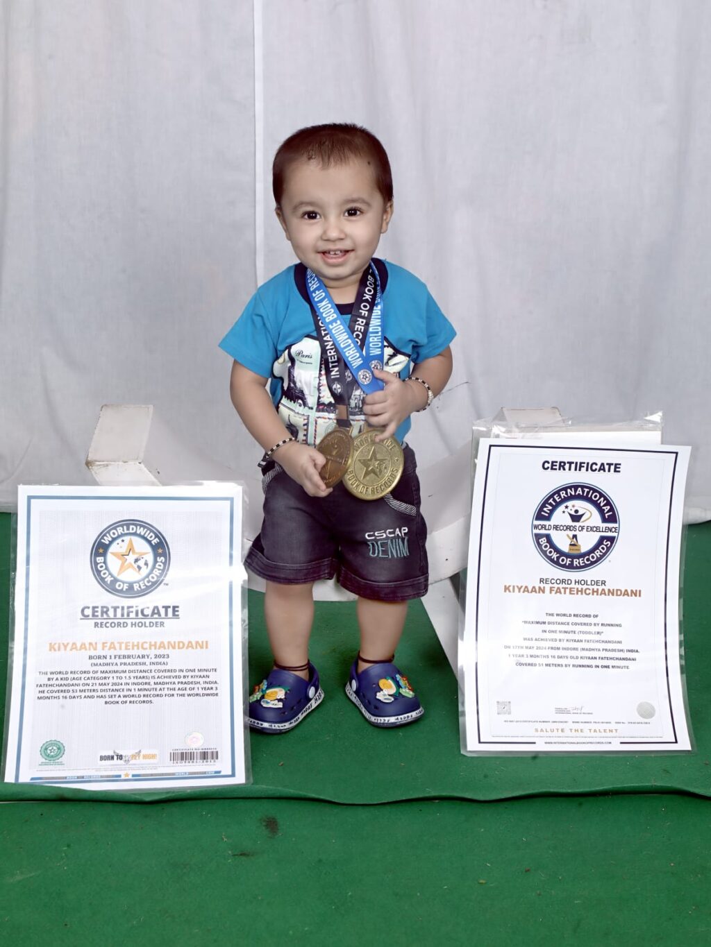 Indore (Team Newsbuddy): Little boy Kian Fatehchandani, born on 1 February 2023, has registered his name in the International Book of Records and World Wide Book of Records by creating a world record in running 51 meters in one minute at the age of just one year and three months under the guidance of his parents Shanaya and Ritesh, grandparents Monica and Anil Fatehchandani.
