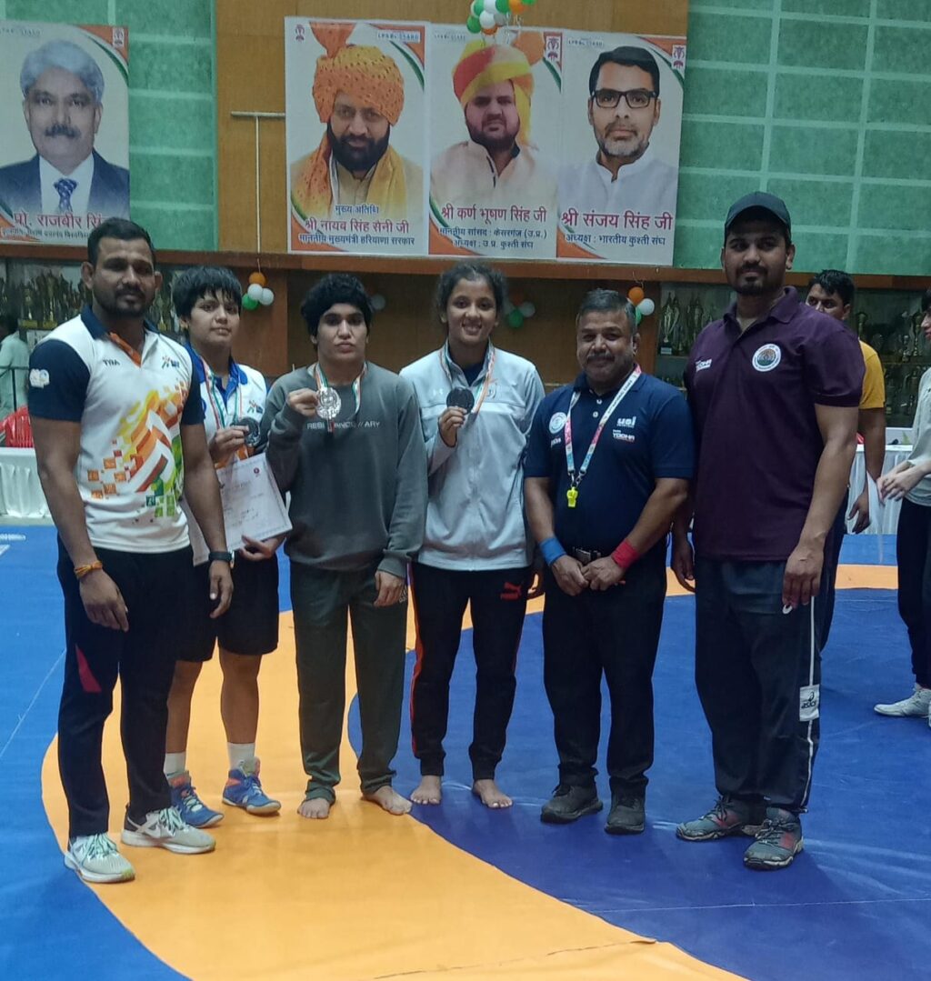 Indore (Team Newbuddy): Vikram awardee Omprakash Khatri of Indore Madhya Pradesh Wrestling Association said that women wrestlers of Madhya Pradesh performed brilliantly and won 1 silver and 2 bronze medals. Pooja Jat of Madhya Pradesh lost to Haryana by 2 points in the final moments of 53 KG and had to settle for silver. Madhuri Patel won bronze medals in 50 KG and Hansaben in 59 KG. International Hansaben defeated Haryana 10-0 but had to settle for bronze after losing to Delhi by a few points. The winning wrestlers are pictured with their coach Jagdish Patel, Manish Khanderao, Rinku Yadav, Lokesh Parmar, Paramjeet Barse and medal winning wrestlers. On this achievement, Olympian Pappu Yadav, Vikram awardee Omprakash Khatri, Suresh Yadav, Govind Gurjar, Vikas Yadav congratulated all the winning wrestlers for their excellent performance. Olympian Pappu Yadav said that in any case, the national wrestling competitions are very tough.