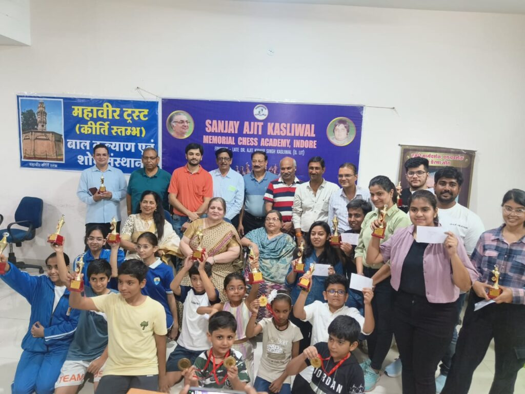 Indore (Team Newsbuddy): To mark the birthday celebration of Dr. Ajit Kumar Singh Kasliwal, the prize distribution of the prize-winning rapid chess competition organized by All Indore Chess Association was held under the patronage of Rajendra Soni, Dr. Rashmi Soni and Dr. Sunil Somani, Bimla Devi Kasliwal. The winning players were awarded with cash prize, trophy and medal! On this occasion, Dr. Anupama Jain, Vikas Jain, Anil Fatehchandani, Apoorv Jain were also present, the guests were welcomed by Mahesh Agarwal, Arun Upadhyay, Shailendra Pabale, Gopal Krishna Malviya! The program was conducted by Neetu Garg and thanks were expressed by Piyush JamindarJamindar. The arbiter team of the competition Deepak Jaria, Prakash Yadav, Dheeraj Dubey, Sunil Panwar conducted the successful competition! The competition was played at Sanjay Ajit Kasliwal Memorial Chess Academy Kanchanbagh run by Mahavir Bal Sanskaar Kendra! In the open category, Harshit Dawar got the first place, Sahil Dadwani got the second place and Vaibhav Prakash Kashiv got the third place respectively. In Under 10 category, first place was secured by Divyan Papriwal, second place by Kabir Gupta and third place by Avik Agarwal.
