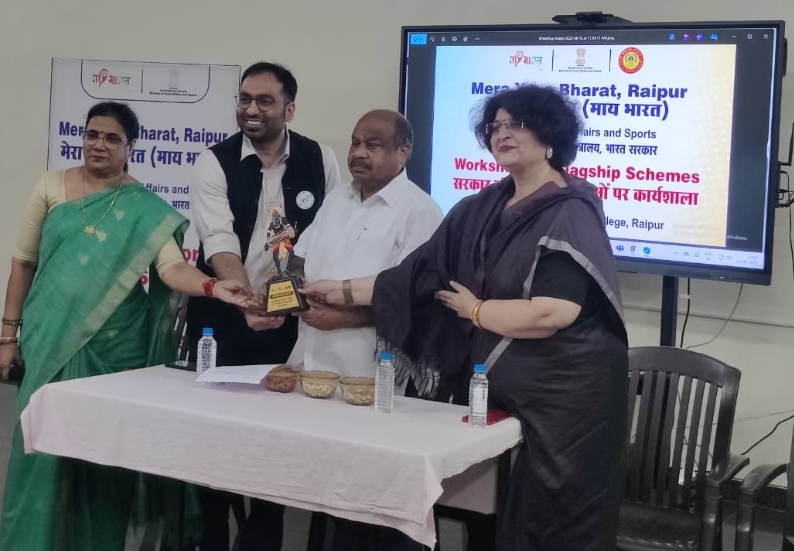 The Chief Guest, Purandar Mishra, MLA, Raipur, addressed the gathering and highlighted various welfare schemes of the Government of India. He stated, “Youth are the heartbeat of the nation. If they are well-informed about government schemes, they can play a vital role in sensitizing their communities and ensuring benefits reach the right people.”